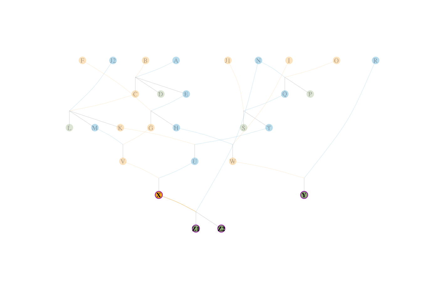 small_ped 的手工溯源剖析为了彻底揭开算法核心,我们从 tidyped(small_ped) 的真实网络中反向推导。目标参考群体是:X,Y,Z1,Z2。