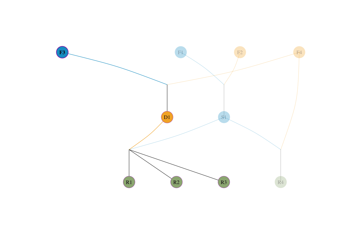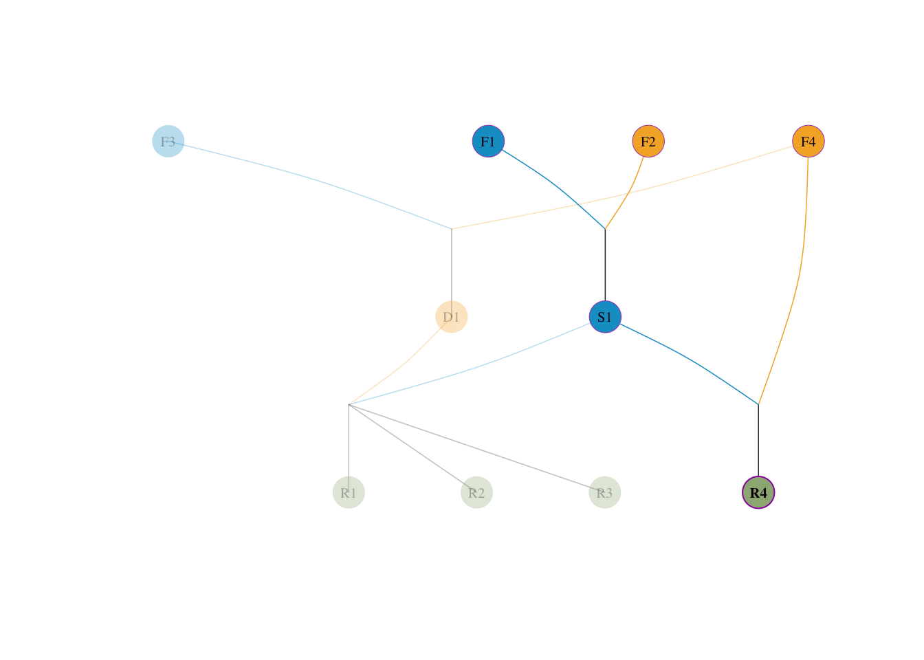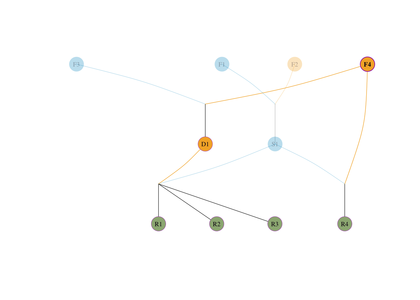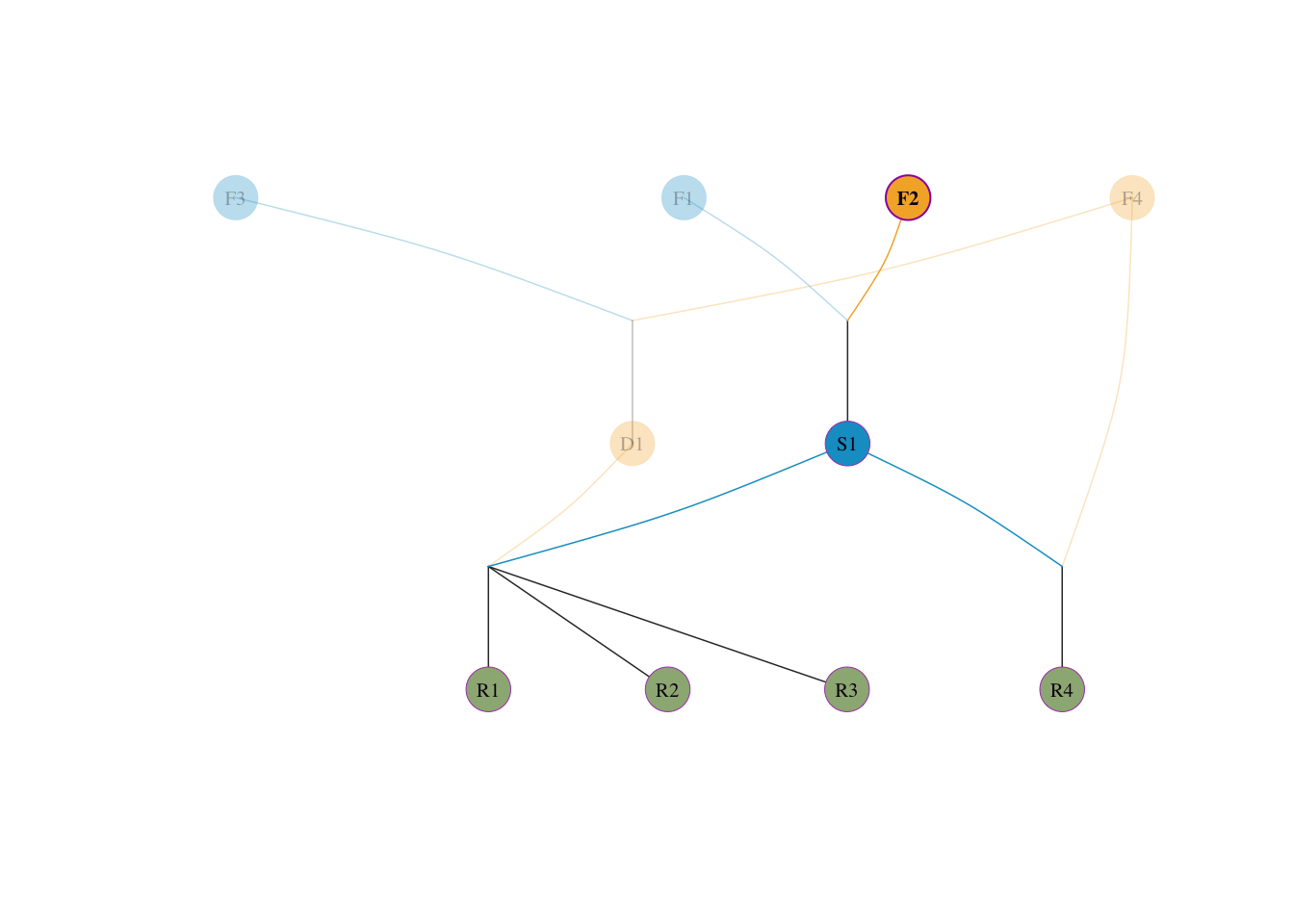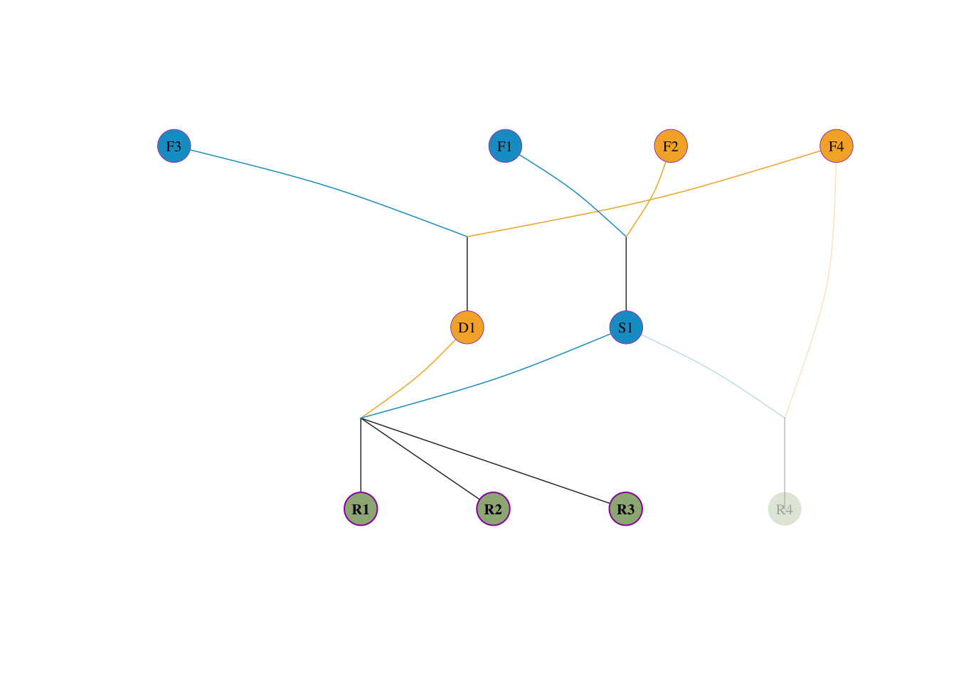 F1, F2, F3, F4(这 4 个个体父母未知)。S1 是由 F1 和 F2 交配产生的(各占其一半血统)。D1 是由 F3 和 F4 交配产生的(各占其一半血统)。S1 表现出众(明星父本),它被过度运用。R1、R2、R3、R4。R1, R2, R3 全是 S1 \(\times\) D1 产生的后代。R4 是 S1 与奠基者 F4 回交产生的后代。先给出该模拟群体的系谱图,便于直观理解后续手工推导。