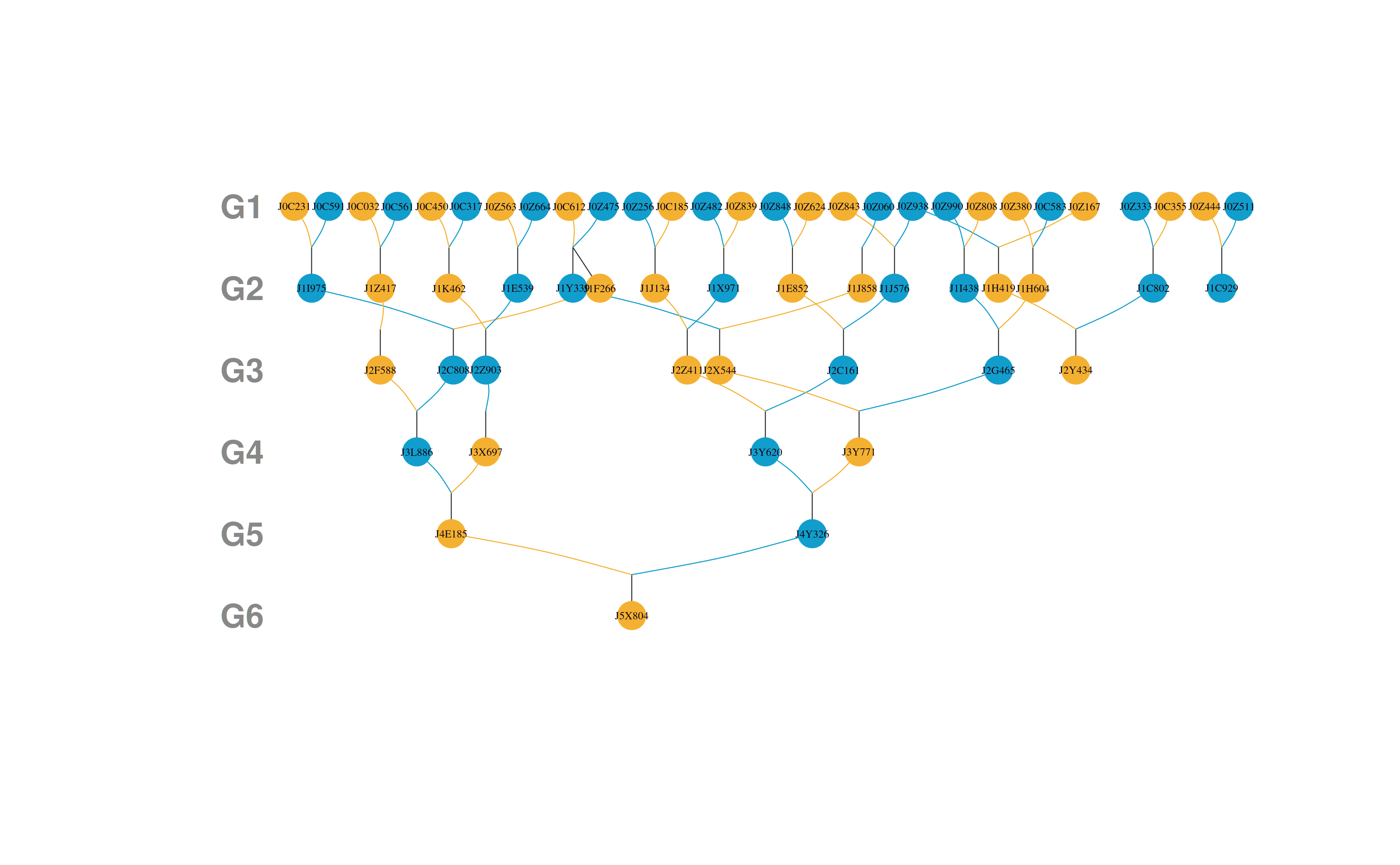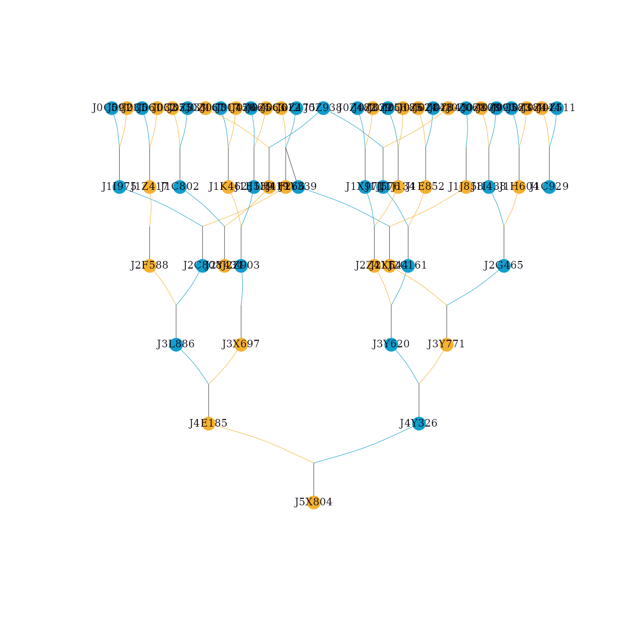 In the above figure, 106 families are shown at bottom, the parents are shown in middle, and the grandparents are shown at top. It can be seen that the parents are composed of 80 sires and 106 dams. The parents are from 54 full-sib families in the generation of grandparent. Approximately 25 parents originate from just two full-sib families due to the application of optimum contribution theory, accounting for 13.44% of all parents.
