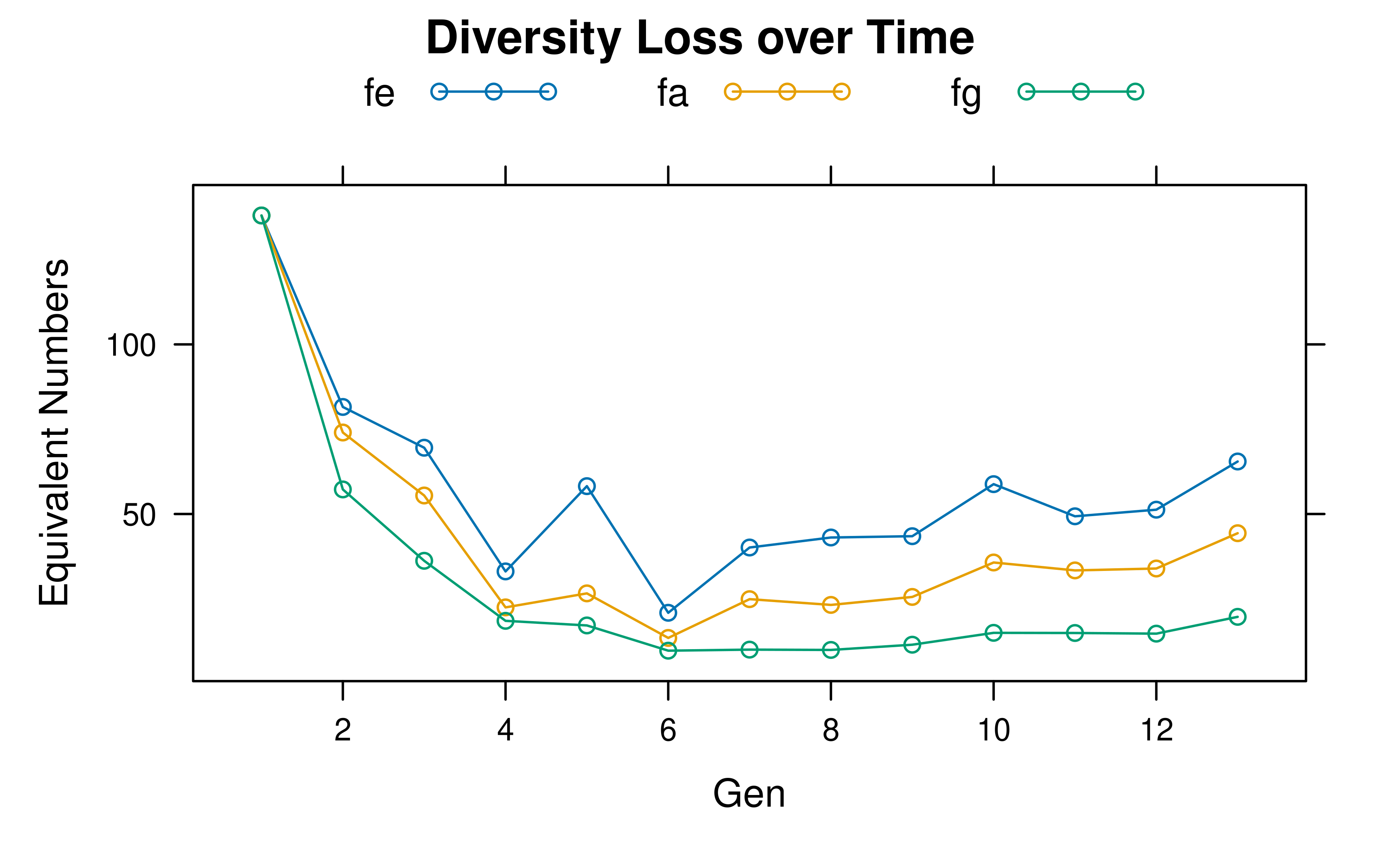 fe,fa,fg, andGeneDivviapediv(); compare withfeHandfaHto assess long-tail founder value. UseGeneDiv(= ) as the headline retained-diversity index for management reporting. - Track diversity dynamics over time with
